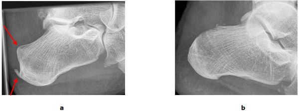 Abb.3: a Sehnensporn und Haglund Exostose im präoperativen Röntgenbild. b Das Fersenbein ist modelliert und die störenden Knochenüberstände wurden entfernt. Der Patient kann wieder schmerzfrei laufen.